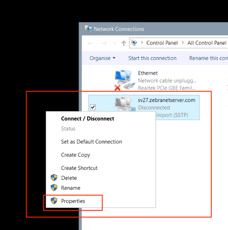 در پنجره باز شده بر روی کانکشنی که در مرحله قبل ساختیم کلیک راست کنید و روی گزینه properties کلیک کنید