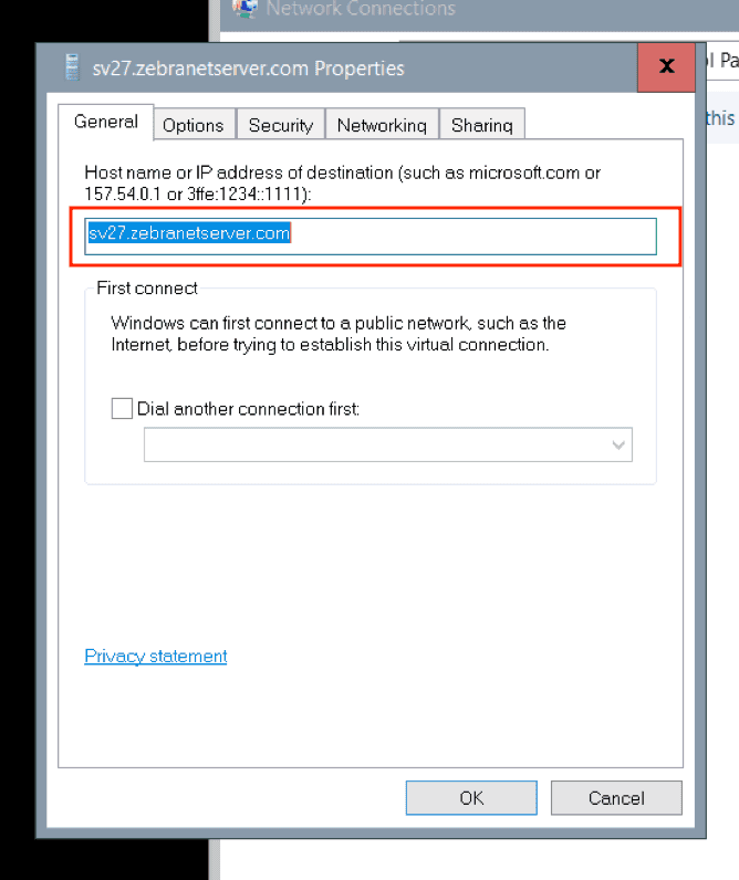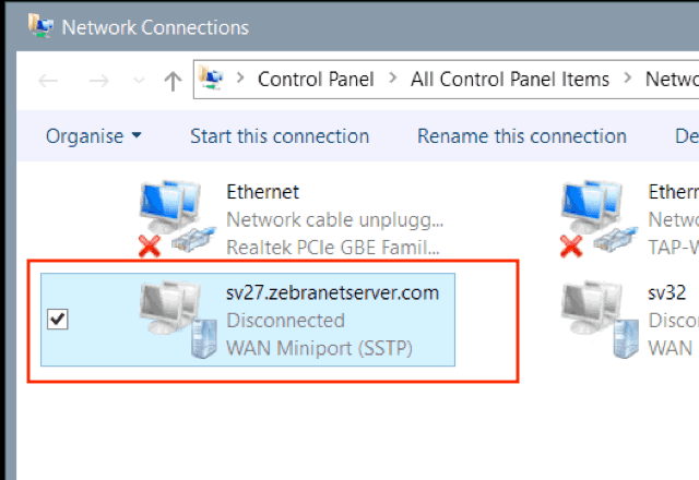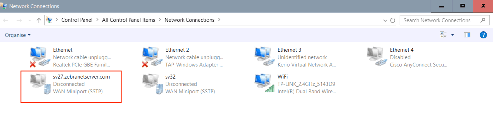 در قسمت اول گزینه Windows را انتخاب کنید، در قسمت Connection name یک اسم دلخواه نوشته و در قسمت Server name or address یکی از آدرسهای SSTP زبرا را بنویسید سپس در قسمت VPN type گزینه Secure Socket Tunnelling Protocol (SSTP) را انتخاب کنید، در نهایت در قسمت Type of sign-in info گزینه Username and passeord را انتخاب کنید و روی دکمه Save کلیک کنید.