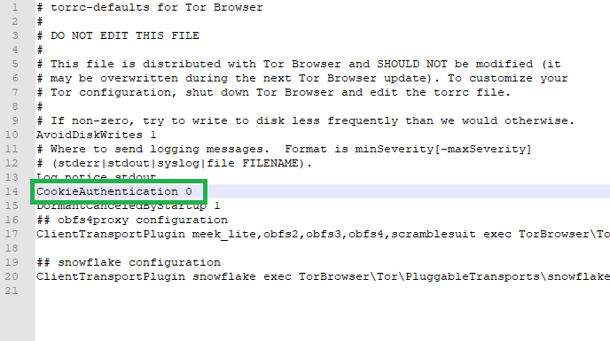 7- torrc-defaults را ویرایش کنید و CookieAuthentication 1 را به CookieAuthentication 0 تغییر دهید